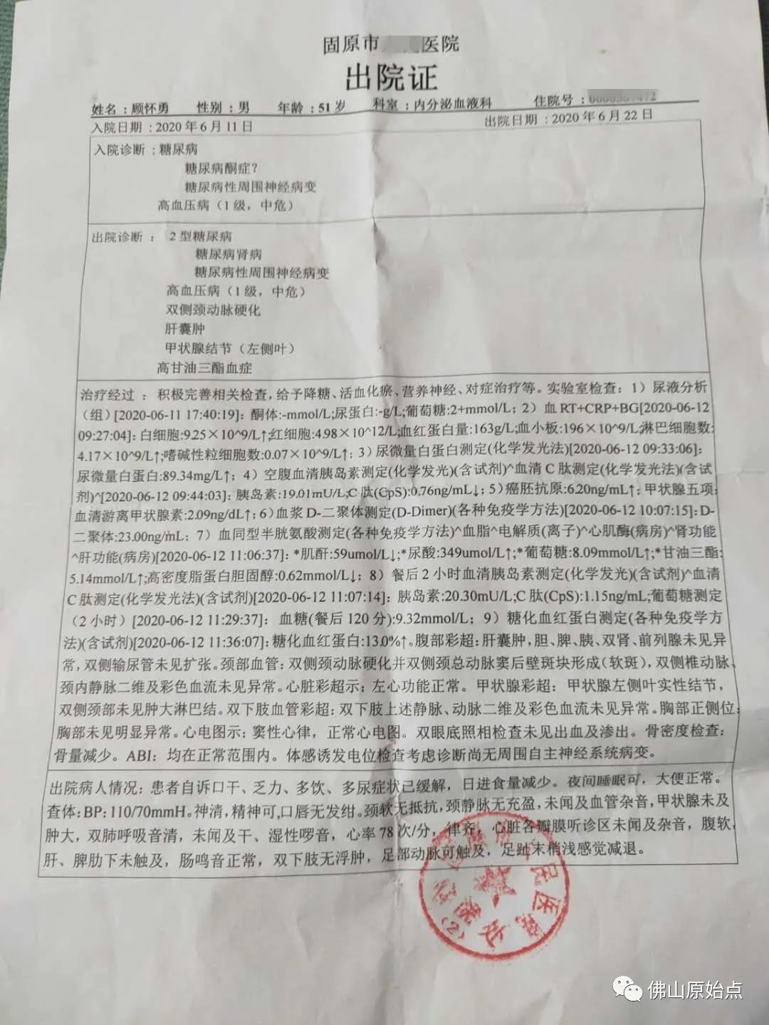 2020年6月份,感觉经常性口渴,去固原第二人民医院做了检查,医生说是糖尿病,住院12天,在医院打点滴,服用胰岛素。