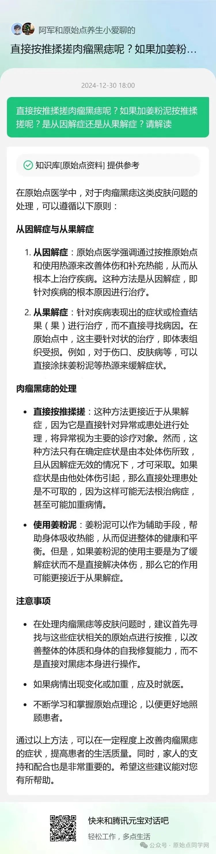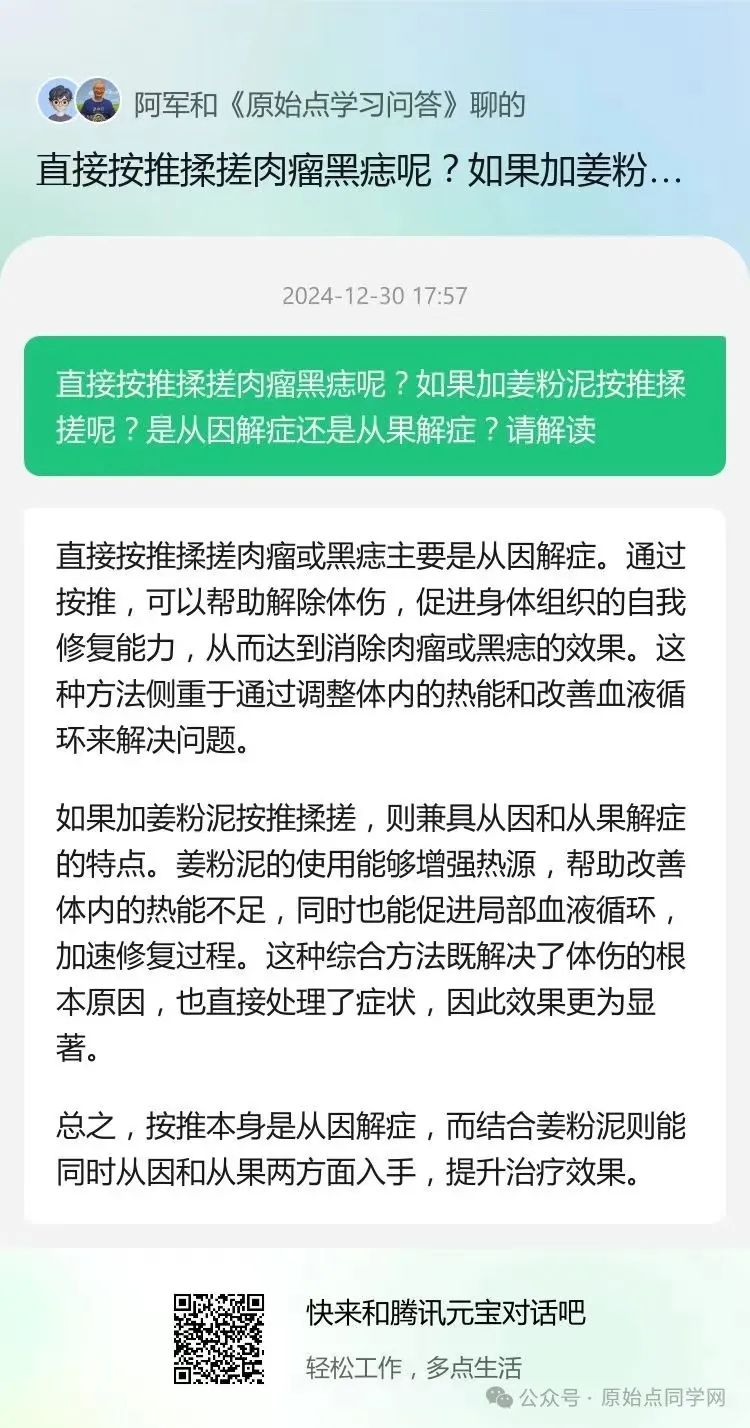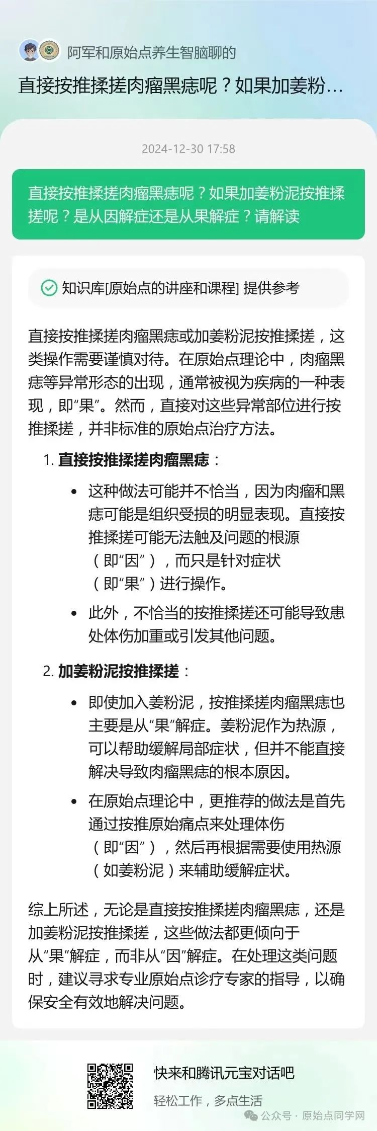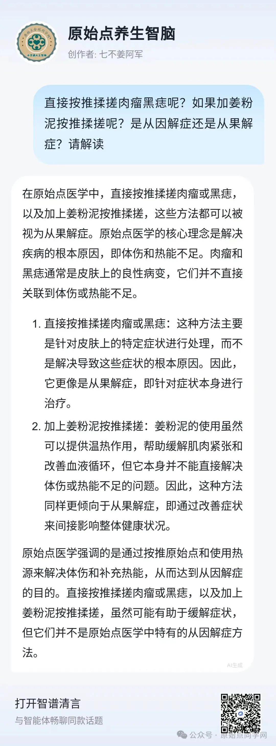 问题:直接按推揉搓肉瘤黑痣呢?如果加姜粉泥按推揉搓呢?是从因解症还是从果解症?请解读