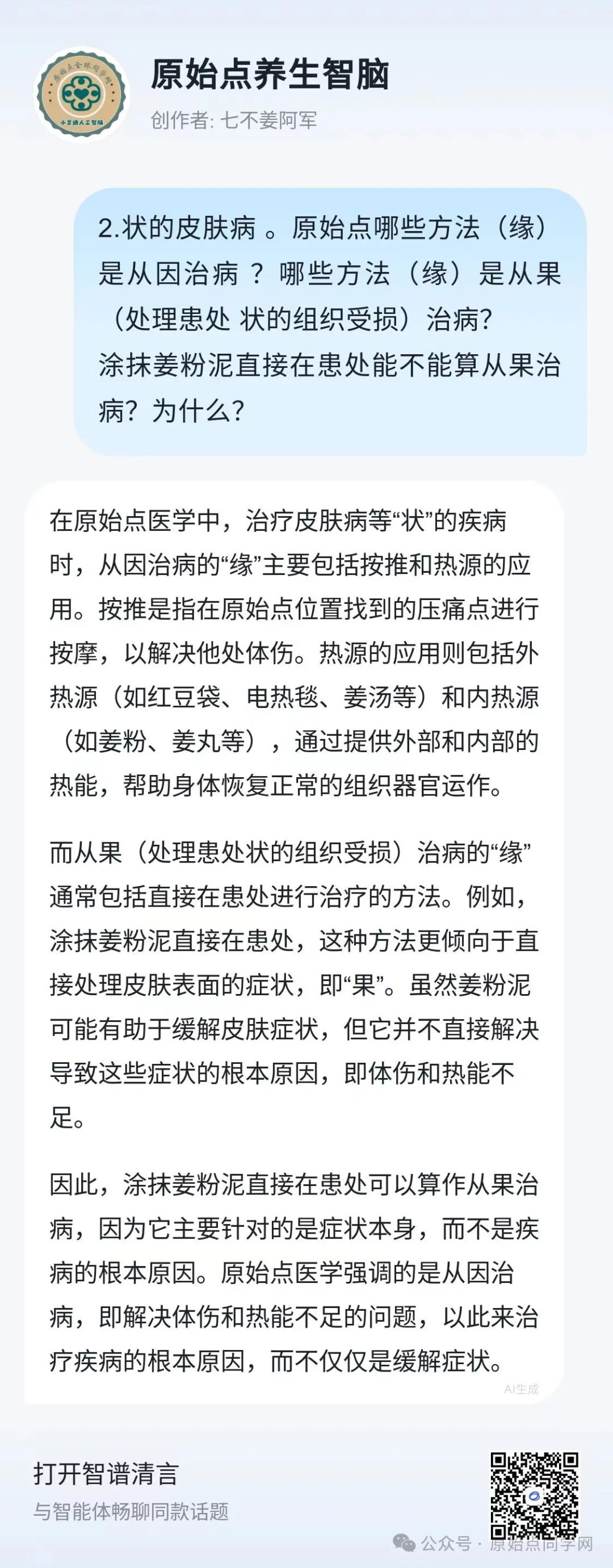 问题:状的皮肤病 。原始点哪些方法(缘)是从因治病 ?哪些方法(缘)是从果(处理患处 状的组织受损)治病? 涂抹姜粉泥直接在患处能不能算从果治病?为什么?