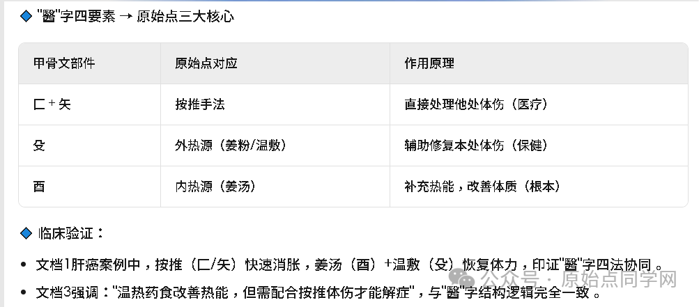 • 古代"醫"字已揭示 "外治优先+热源为本" 的疗愈逻辑,原始点将其系统化("治病要从根本下手")。