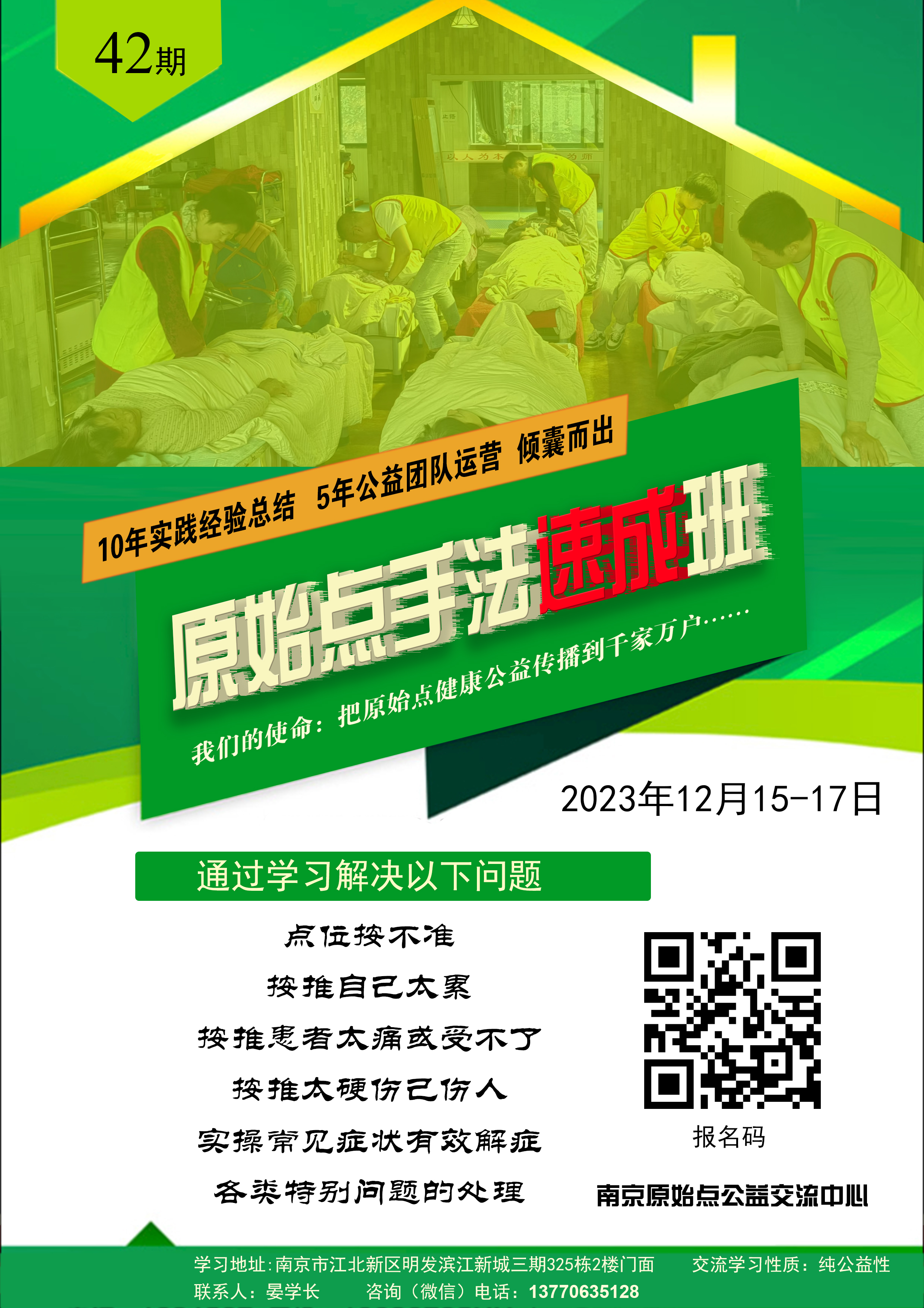 唯一不变的是永远在变!--张医生 为了提升广西原始点爱好者的手法及理论! 广西原始点公益推广组建交流团队, 不管你已经学习调理使用原始点多久通通放下,昨天已是过去;今天因,以人为本,以病为师,放空知见,从零开始,请重新学习原始点吧! 一、学习内容: (一)理论 原始点医学图 诊断、治疗、疾病由来 (二)他处手法 1.原始点最新手法是拨筋,而不是推筋 2.如何在拨筋中,放松身体。 (三)患处拨筋手法与姜粉的应用 1.姜粉泥制作 2.姜粉泥内服 3.姜粉泥正确按推涂抹方法示范 头部、脸部、背部、四肢、腹部 (四)常见疾病处理分享 1.感帽发烧 2.各种疼痛 3.刀伤烫伤 4.急救等 二、如何报名: 原始点爱好者请将:姓名、电话、性别、年...