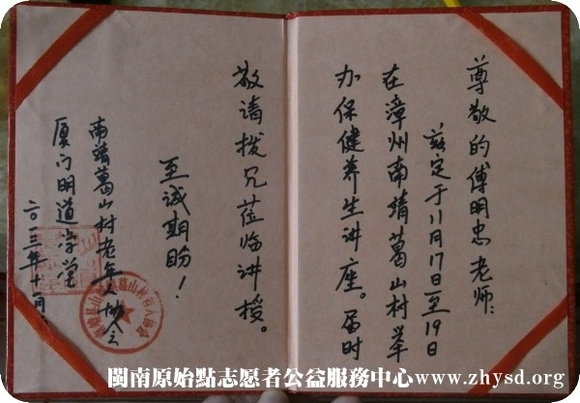 受 漳州南靖葛山村委、葛山村党支部,葛山村老年协会邀请,闽南公益志愿者团队将于11月17-19日前往漳州市南靖县葛山村虎头山孔子学校与厦门明道学堂一起为葛山村老人举办为期三天的传统文化及原始点健康讲座,同时为乡村老人进行原始点公益按摩保健。