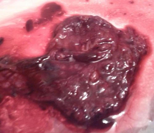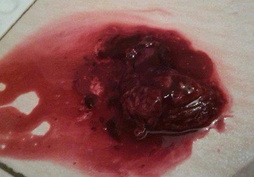 8月9日,他们夫妻俩就来到了我们服务中心,我更详细地了解了相关情况得知就是小腹坠胀痛外,其它没有什么不适。于是就开始帮他夫人做原始点:从下背部开始到荐椎到臀部。下背部没有痛点,荐椎和臀每个点都很痛并且伴有痉挛痛。来回按完两次以后,小腹坠胀痛感消失。当天晚上回去就排出紫色肉状血块,看上去已有初步人形显现,如下图: