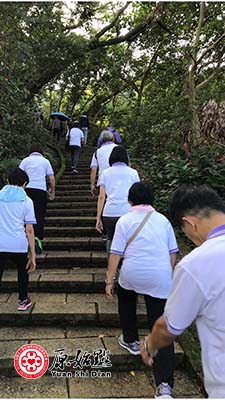 按原定安排,第二天早上李师兄就带领我们爬九五峰,儒雅的郭博士也准时来参加。从基金会出发的路上,12人的队伍在街道上虽说不上浩荡,但是却是一条人龙,然而,登上山脚後,因个人体能的差异而越走越没有队形了!一路上藉着拍照留念的藉口而歇息,也听着李师兄的每天如何坚持运动的故事,给了我们激励、也给我们树立了学习的好榜样。下山回到基金会後,李师兄趁着我们休息的时候,就马不停蹄的为日间重症学员按推解症,他的过人精力和无私奉献精神,实在令我们敬佩。之後李师兄分享重症案例和他在临床上的实作经验。当中重点分享陈绸阿嬷的动人故事,令人动容。