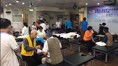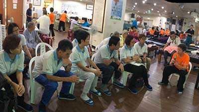 此外,我们也目睹了基金会的师兄师姐们是如何无微不至的照顾在场的每一位学员,他们简直是把学员视为亲人一般的体贴与呵护,没有分别心,这无私的爱心,把旁观的我们都融化了!学员与家属们也非常的信任与敬重志工,当然,这与志工们能够以精练的手法为他们解症这关键是密不可分的。志工之间协作得非常融洽,工作有序;学员与家属们都非常听话的用心学习,学员之间也会互相帮忙。整个场地虽然人多却不吵杂,而且温情随处可见。公益性的基金会在运作上非常细心照顾每一个区块,例如中午12点准时开饭用美味的温热性午餐;12:30~1:30午休时间,全场关灯休息;1:30~2:00大家一起跟着视频跳郑多燕韵律操;全天都提供热姜汤让大家补充热能,甚至还有浓姜汤供应重病学员;重病学员运动时,都有资深志工陪伴。