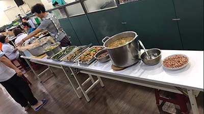 厨房烹饪方面,志工以11杯米加入2汤匙的姜粉和姜汤来煮饭。其他的配菜则少油少盐、并都配搭姜丝或姜粉、辣椒、胡椒粉与姜汤来烹调。
