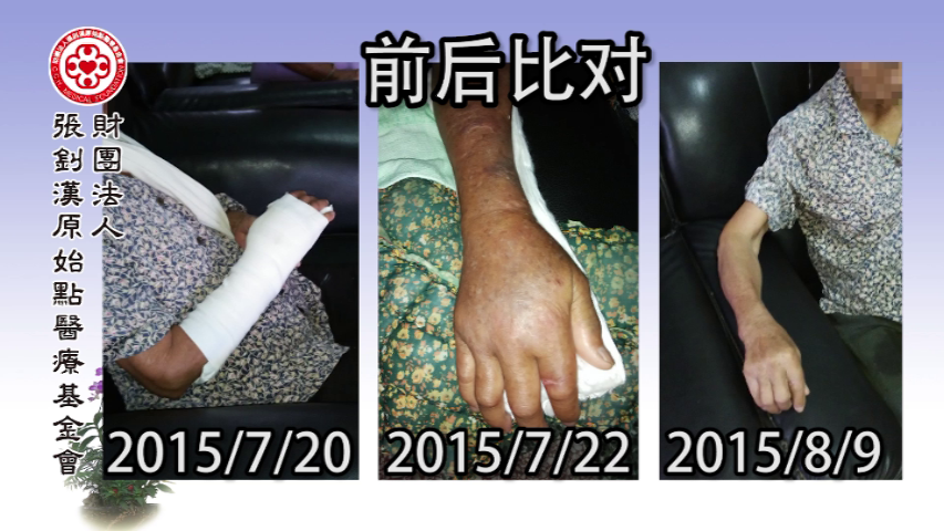 缘起─ 2015年7月20号上午约10点左右,87岁的母亲站在小板凳上,踮脚尖伸手取高处物品,一个重心不稳,双脚踩空,身子突然往右前方跌下, 右手掌不自主地往地板上用力一撑,导致右手腕骨头断裂,扭曲变形,马上疼痛难当,整只手动弹不得,于是立刻去挂急诊。 我们私底下就已决定不开刀了。