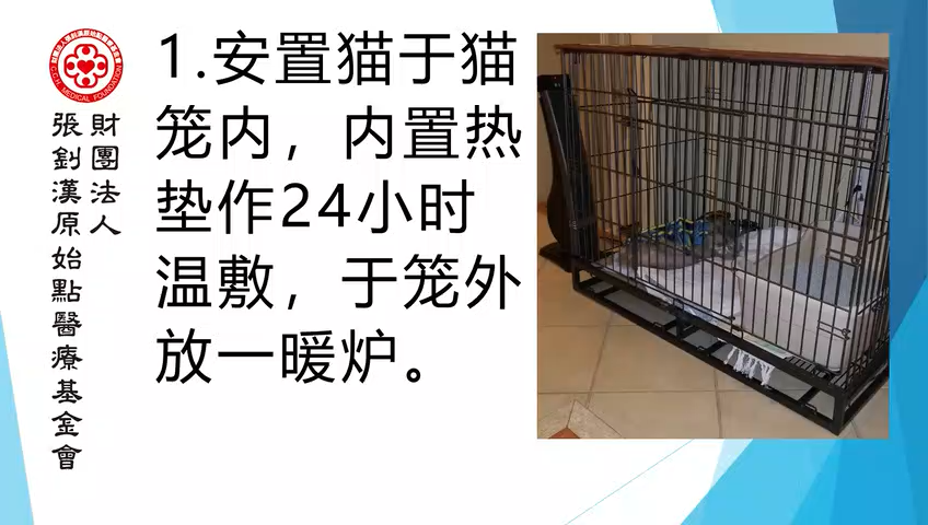 1.给它穿紧身衣張財剑團后放小暖包于臀。安置猫于笼内,内置热垫作24小时温敷,于笼外放一暖炉。如加护病房般隔离其他猫的干扰,使老猫能全程静养