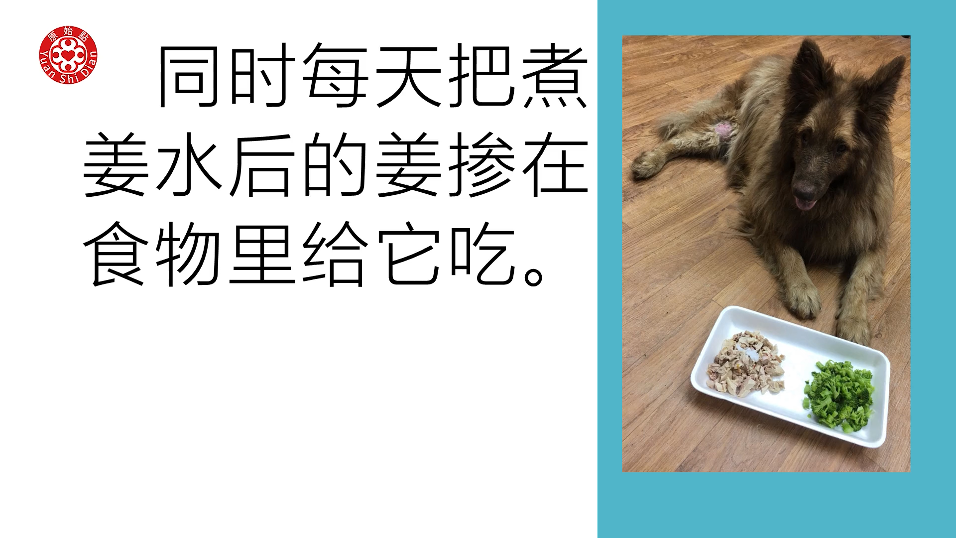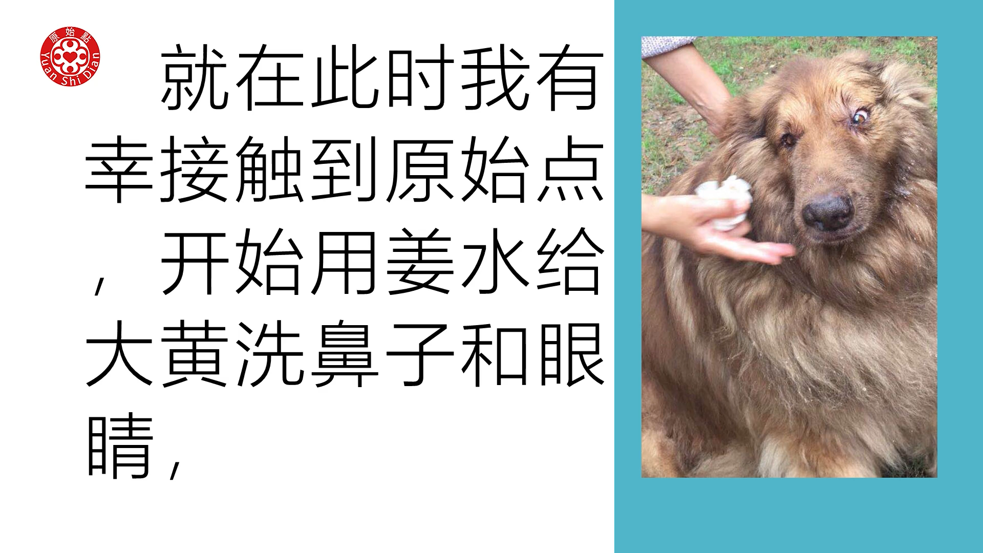 就在此时我有幸接触到原始点,开始用姜水给大黄洗鼻子和眼睛晴,同时每天把煮姜水后的姜掺在食物里给它吃。