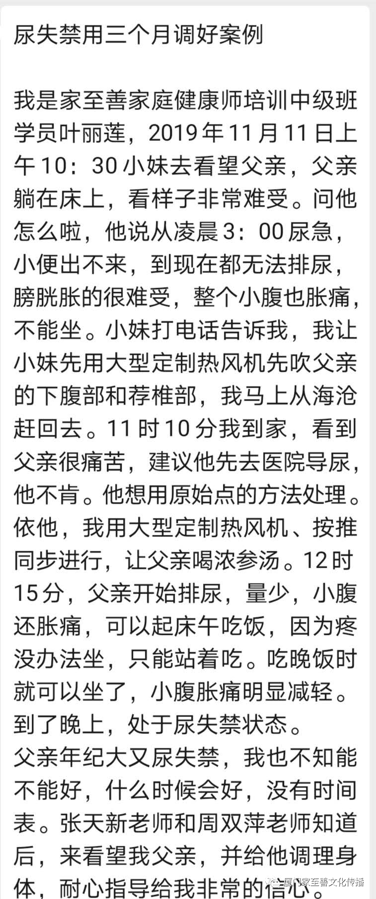 今天分享的是我们中级师资班班长叶老师,分享的是他95岁的父亲尿失禁的调理过程,通过她每天悉心地照料调理,三个月时间,她父亲的尿失禁完全好了,看到她父亲不用受尿失禁的痛苦,也不用每天换纸尿裤,父亲脸上露出往日的笑容,她感觉这三个月再辛苦也值了。