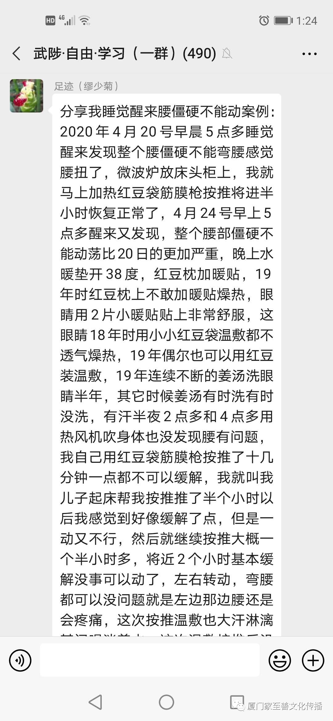 今天分享的是福安的一位家人讲述她两次凌晨醒来腰僵硬,不能动弹的案例,上次她在武陟公益点群有文字分享,我看了觉的这案例不错,问她有没有图片和视频想做成案例,昨天晚上特地录了视频,想让更多的人受益,2020年4月20日第一次自己用按摩枪处理了半小时,就缓解了,2020年4月24日凌晨又不能动弹了,自己处理了十来分钟一点缓解都没有,就让儿子帮忙坚持处理了二个小时才缓解。