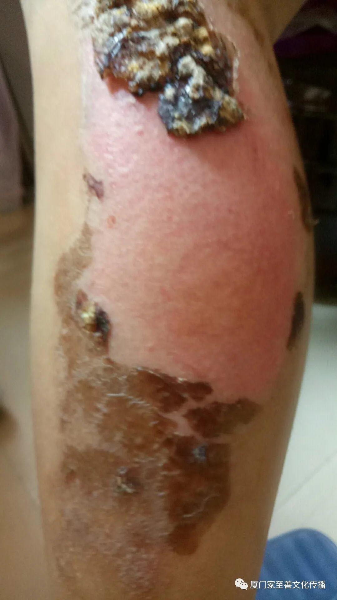 这时就赶紧回家用热风机吹干伤口后洒了姜粉,之后就用热风机的专用睡袋全身温敷。温敷后前两天组织液流了很多,旁边也起了水泡。