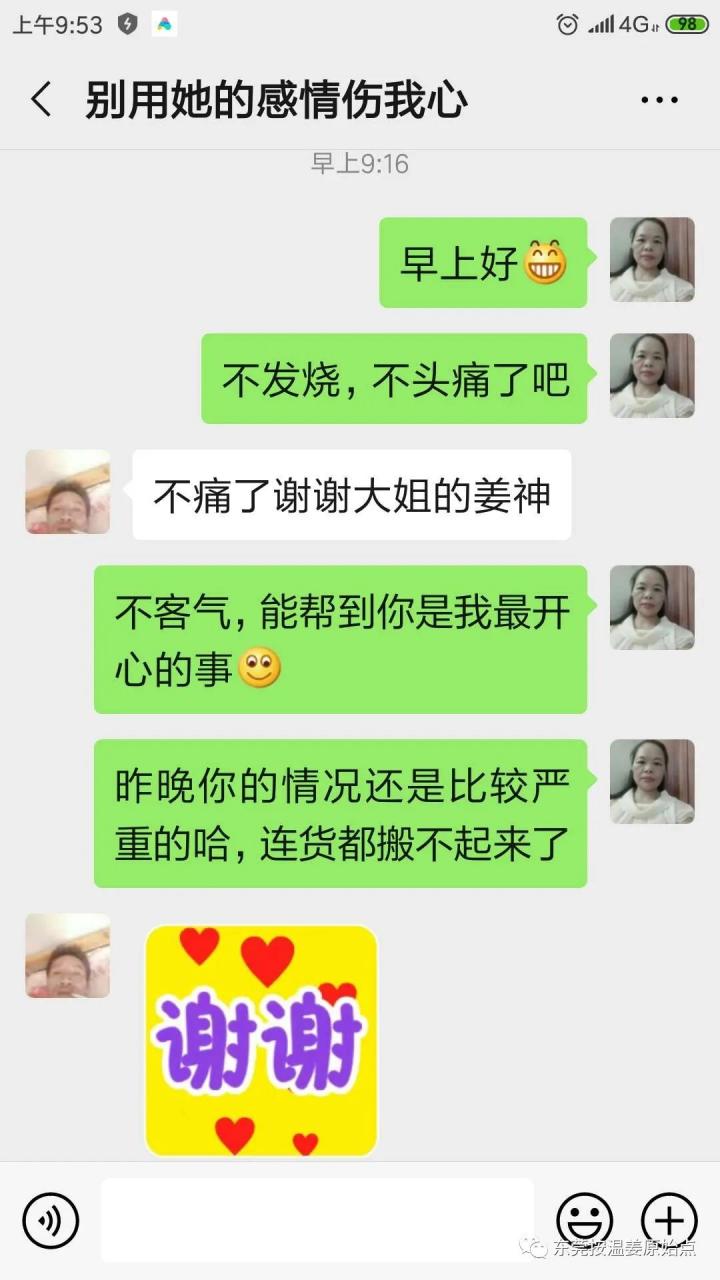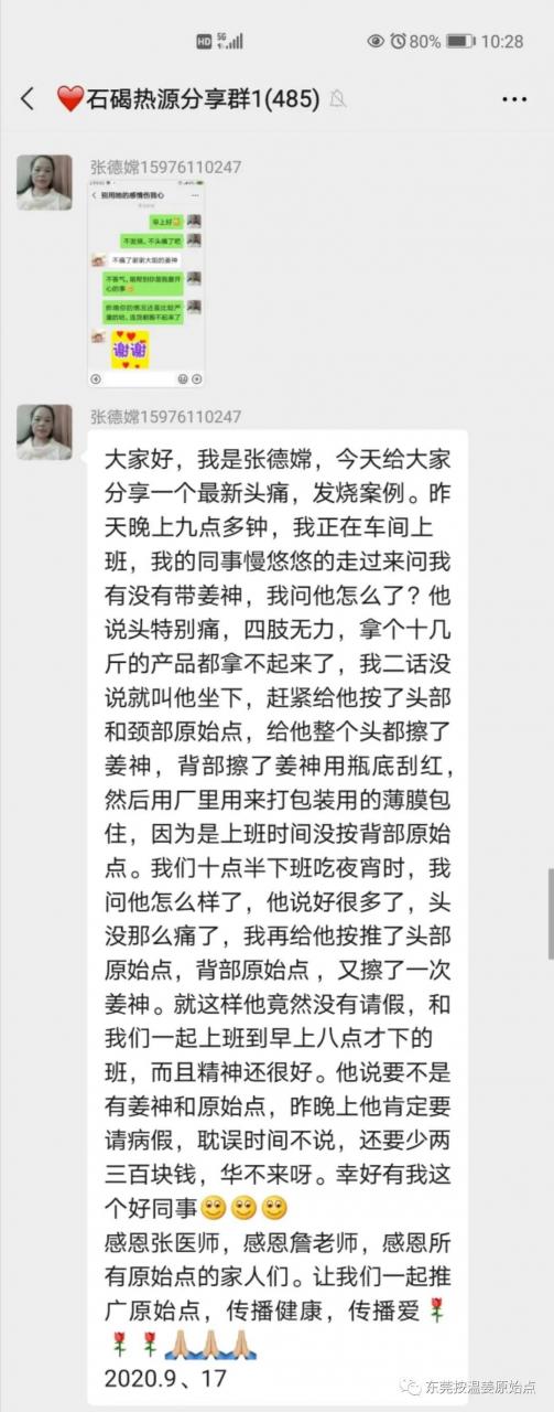 今天给大家分享一个最新头痛、发烧案例,昨天晚上九点多钟,我正在车间上班,我的同事慢悠悠的走过来问我有没有带姜神,我问他怎么了?他说头特别痛,四肢无力,拿个十几斤的产品都拿不起来了,我二话没说就叫他坐下,赶紧给他按了头部和颈部原始点,给他整个头都擦了姜神,背部擦了姜神用瓶底刮红,然后用厂里用来打包装用的薄膜包住,因为是上班时间没按背部原始点,我们十点半下班吃夜宵时,我问他怎么样了,他说好很多了,头没那么痛了,我再给他按推了头部原始点,背部原始点,又擦了一次姜神,就这样他竟然没请假,和我们一起上班到早上八点才下的班,而且精神还很好,他说要不是有姜神和原始点,昨晚上他肯定要请病假,耽误时间不说,还要少两三百块钱,划不来呀,幸好有我这个好同事。