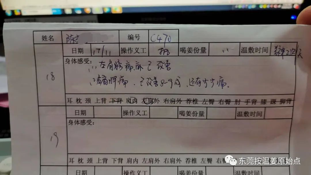 陈先生,今年55岁,广东东莞人,左边肩膀麻痹,痛、左肩胛痛一周,听人说用啤酒瓶放在颈椎后面滚动按摩有效果,陈先生也去试过,当时按时舒服点,一个钟后又没有效果了,曾受益过原始点的陈先生(石碣公益原始点编号C470)2020年11月12号来到公益中心,志工给陈先生按推后,外用姜神、红豆袋温敷后,陈先生分享轻松很多,11月13号第2次来公益中心,按推温敷后,陈先生分享左边肩膀麻痹,痛、左肩胛痛已改善7-8成,11月17号原始点调理5天陈先生分享左边肩膀麻痹,痛已康复,左肩胛痛也已改善9成。