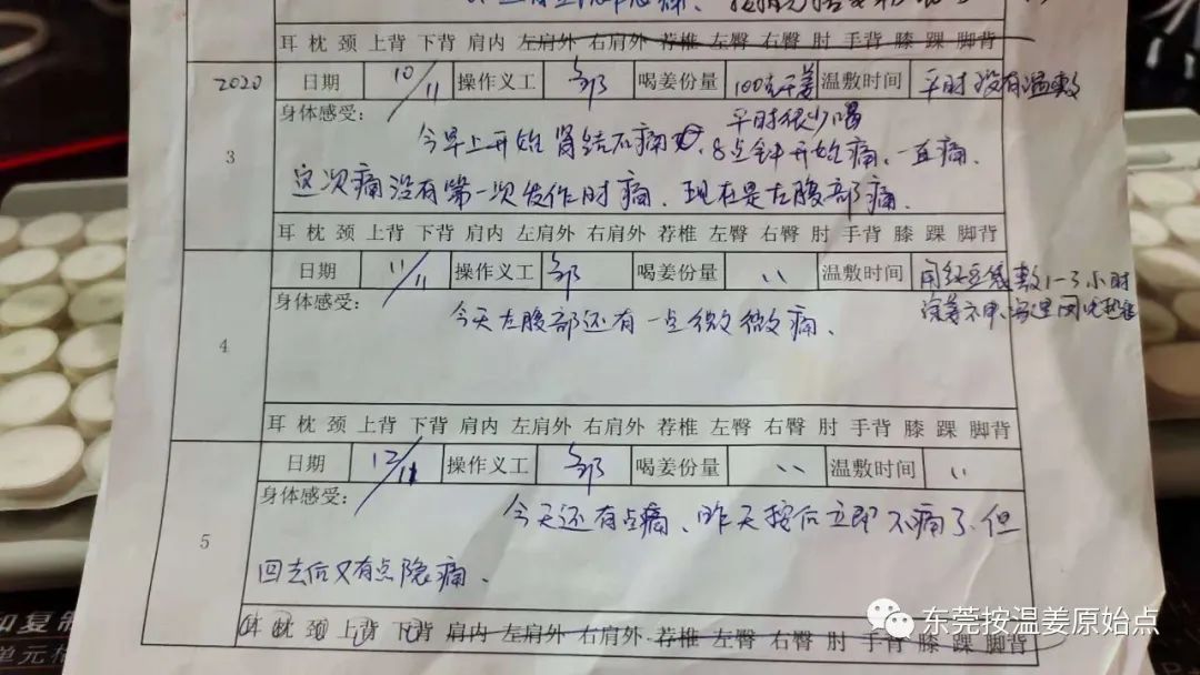 梁先生,东莞中堂人,今年38岁,2020年11月10日早上8点左上开始左腹部痛,一直在痛,曾受益过原始点的梁先生(石碣公益原始点编号L1465)这时并没有选择直接去医院,而是选择了来石碣公益原始点调理,志工邹师兄给梁先生按推下背部原始点后,外用姜神、红豆袋温敷,晚上睡电热毯温敷,煲100克干姜,每隔20-30分钟喝一小口姜水补充内热源,避免寒凉食物,11月10号当天下午回去的时候左腹部痛减松了很多,11号中午梁先生第2次来公益中心按推温敷后,左腹部还有一点微微痛,12号中午梁先生第3次来公益中心按推温敷后,左腹部还有点隐隐痛,13号梁先生没有来公益中心,志工电话给梁先生,梁先生分享左腹部已经不痛了。