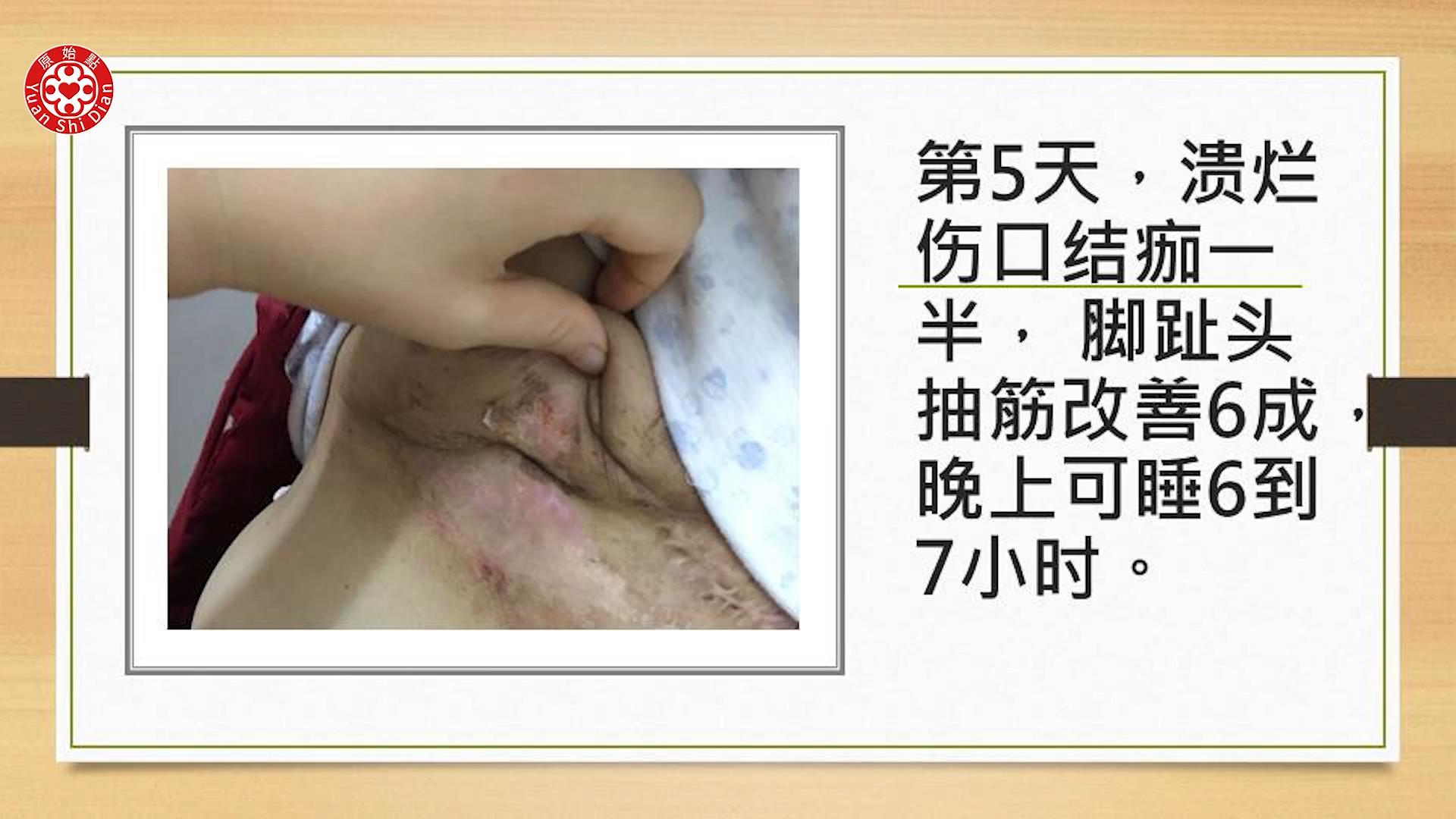第5天,溃烂伤口结痂一半,脚趾头抽筋改善6成晚上可睡6到7小时。