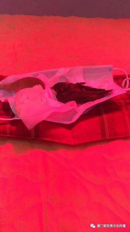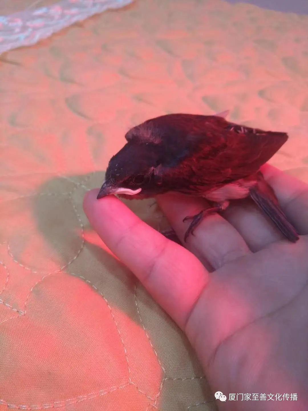 今天分享的是2020年6月2日我们的一个学员救助一只受伤的小燕子案例,这只燕子宝宝刚学会飞,不小心从窝里掉下来受伤了,燕子妈妈一直在电线上面呼叫,对面阿姨把它放在三轮车后面,下午小燕子突然就到了学员开的理疗店里面,来的时候全身发抖,她的店里有红豆袋和暖灯,就给她热红豆袋开暖灯,喂了一些姜汤,并给她做全身的按推,最后再用馒头沾姜粉给它吃,很快小燕子就恢复正常了。