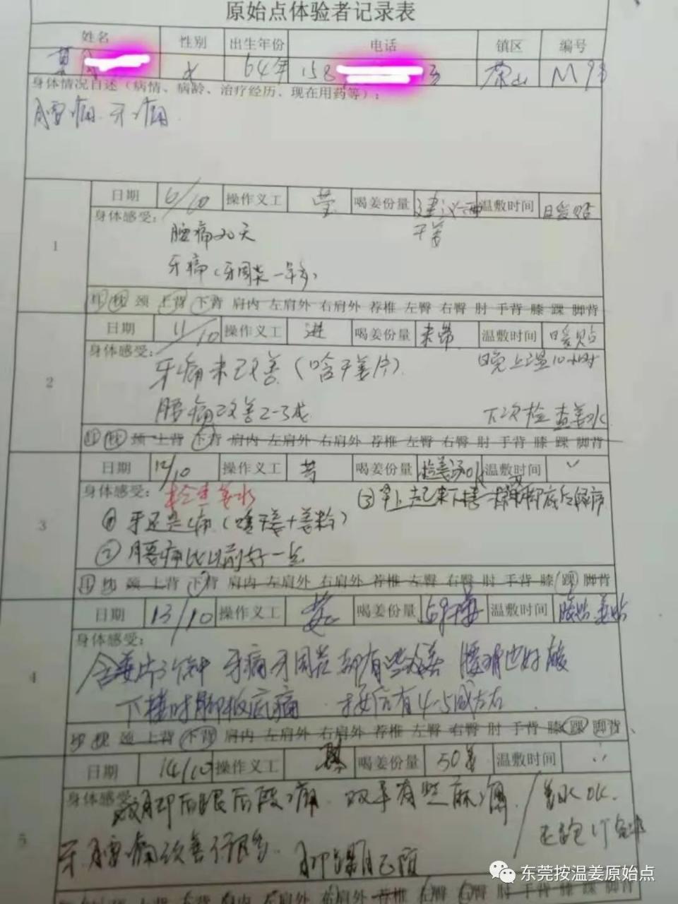 3、一周后,莫女士腰痛牙痛有所改善,10月14号莫女士告诉石碣公益原始点的志工,她的双手指麻痹十多年了,脚后跟痛半年,现双手指麻、脚后跟痛已改善4成。