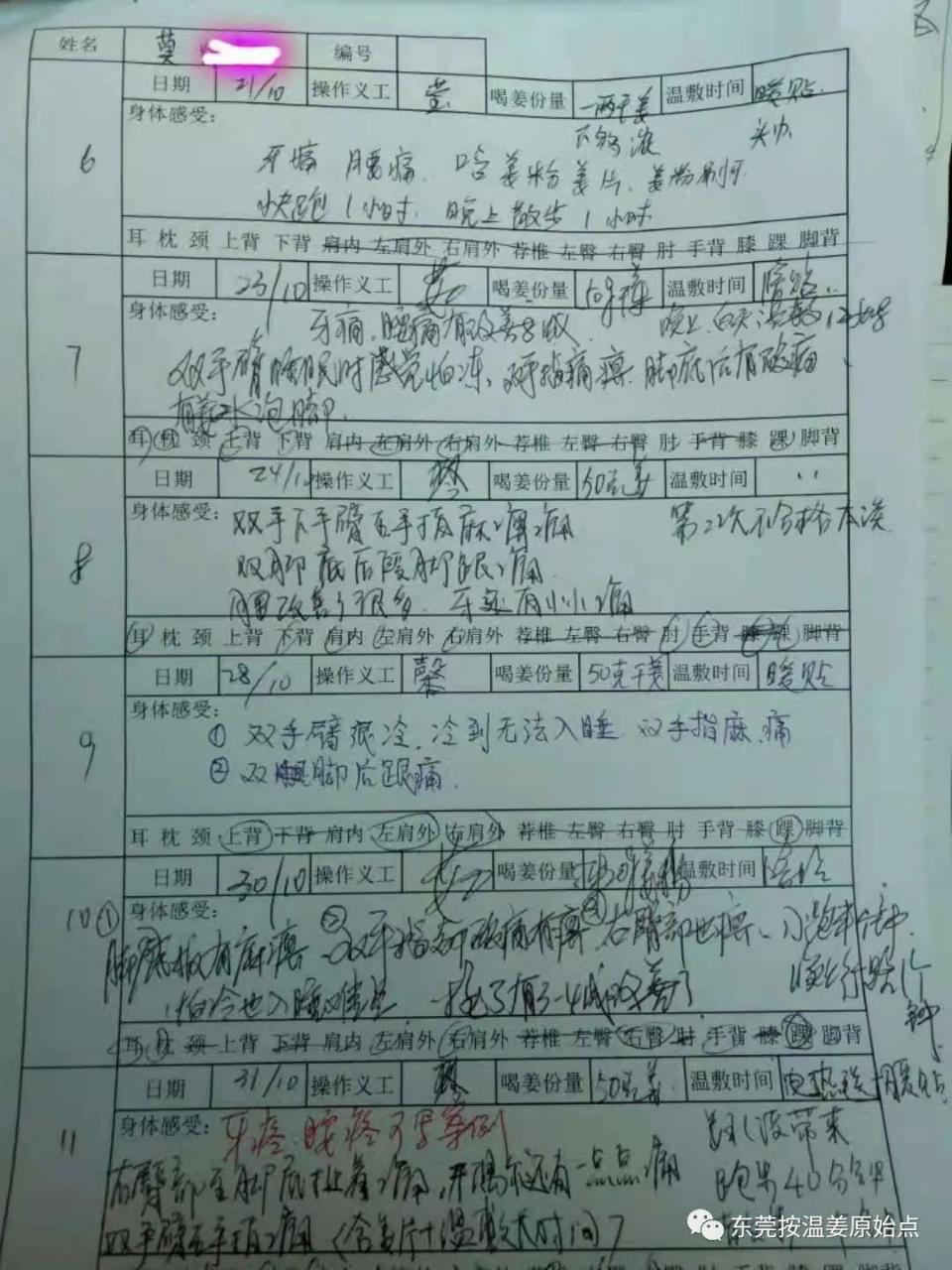 截止到2018年11月11号,莫女士原始点按推共12次,一直用暖贴长时间温敷补充外热源,每天煲50克干姜水2道喝补充内热源,每天坚持跑步40分钟到一个小时,每天口含干姜片或姜粉,现改善情况如下: