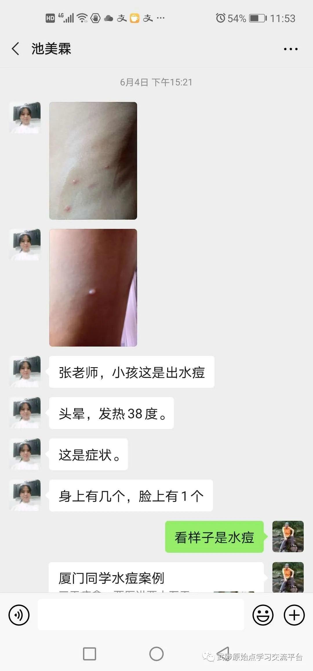 今天分享的是我们(中级班)的学员也是第五期至善1组组长池美霖的儿子出水痘康复的案例,以下是她的讲述: