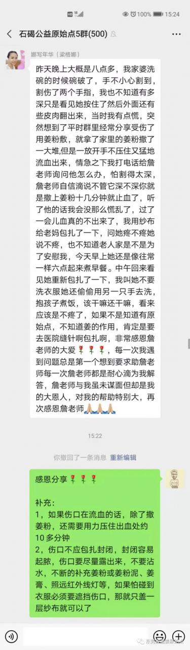 昨天晚上大概是八点多,我家婆洗碗的时候碗破了,手不小心割到,割伤了两个手指,我也不知道有多深只是看见她按住了然后外面还有些皮肉翻出来,当时我有点慌,突然想到了平时群里经常分享受伤了用姜粉敷,就拿了家里的姜粉撒了一大堆,但是一放开手不压住又猛地流血出来,情急之下我打电话给詹老师询问他怎么办,怕割得太深,詹老师自信滴说不管它深不深你就是撒上姜粉十几分钟就止血了,听了他的话我会没那么慌乱了,过了一会儿血真的不出来了,我用纱布给老妈包扎了一下,问她疼不疼她说不疼,也不知道老人家是不是为了安慰我,今天早上她还是像往常一样六点起来煮早餐。中午回来看见她重新包扎了一下,我叫她不要洗衣服她还偷偷用另一只手去洗,抱孩子煮饭,该干嘛还干嘛,看来应该是不疼了,如果不是知道有原始点,不知道姜的作用,肯定是要去医院缝针啊包扎啊。