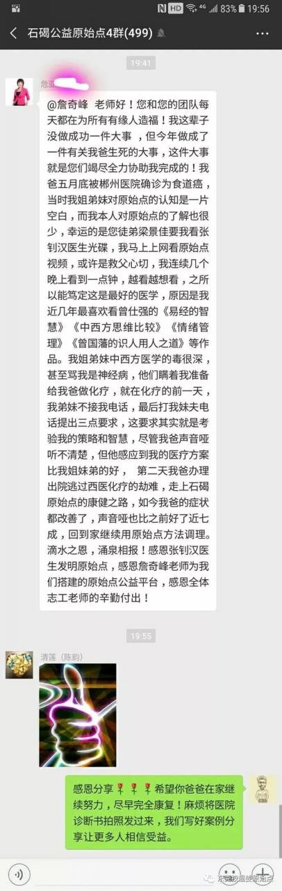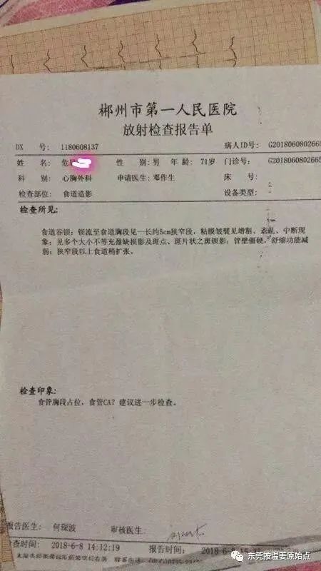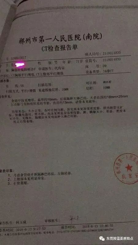 危先生,71岁,湖南人,因平时说话声音沙哑,吃饭、喝水感觉有东西卡住,于2018年6月12号在郴州医院检查,住院5天等待检查结果,住院五天只是吃药,拒绝输液,五天后,也就是2018年6月17号检查报告单出来了,危先生平时身体上的种种不适原来是【食道癌晚期】,因危先生的女儿了解过原始点,知道放疗化疗对身体的伤害,说服了家人,拒绝了医院的治疗,并以到上级医院治疗为由办理了出院手续。