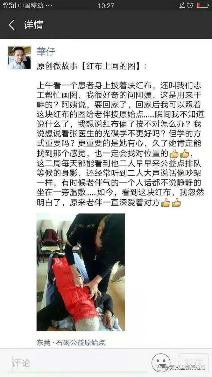 危先生的爱人叫石碣公益点的志工帮忙画原始点的按推图,她说,回家后,我就可以边看张医生的教学视频,也可以拿这块红布上的图帮老伴按推了啦,满满的感动,满满的爱意,满满的温暧啊,危先生的身体恢复的这么好,除了他自己本身的坚持与配合外,也离不开亲人的关心与陪伴啊!