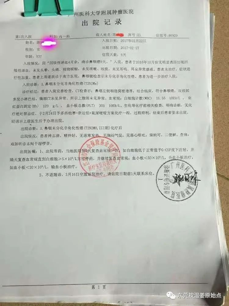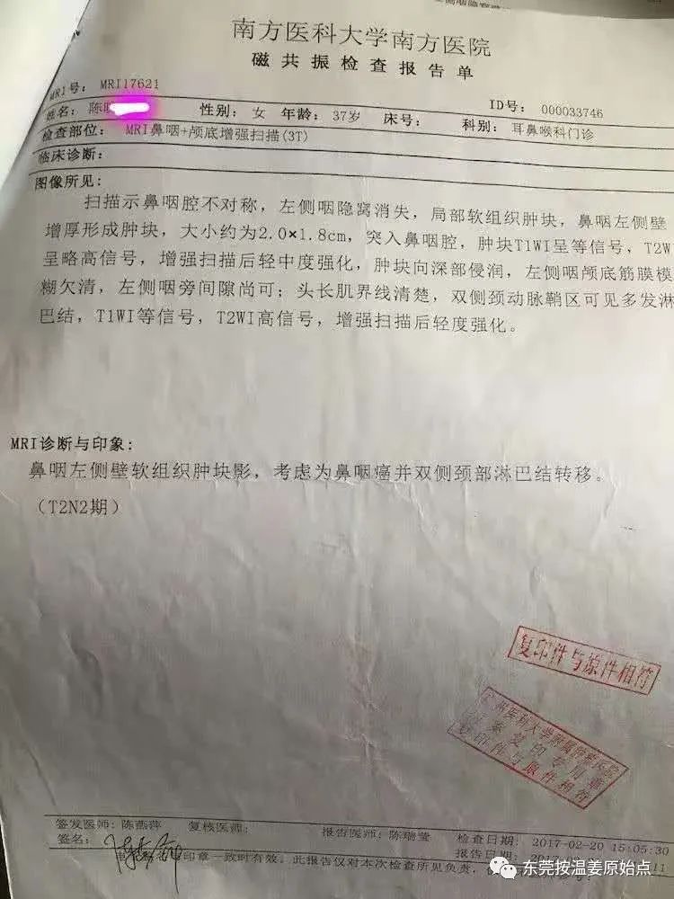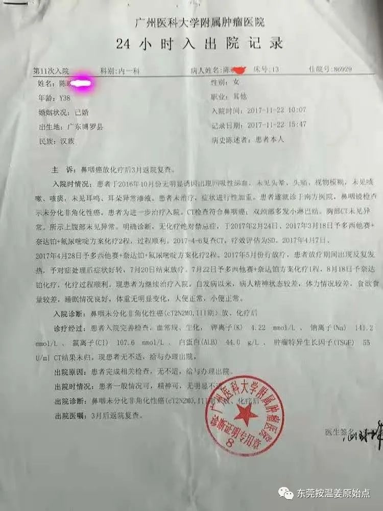 陈女士,今年39岁,广东惠州园洲人,2017年2月因鼻子不舒服(按一下就会痛),2月22日去医院检查被查出鼻咽癌3期,最后一次入院2017年11月,长达9个月的医院抗癌之路真的痛不欲生,一共放疗33次,化疗6次,在放疗到18次的时候感染肺炎,高烧41度不退烧,7月份一个月进了2次ICU,因为几天高烧不退,陈女士说睡在那冰床上冷到想死。