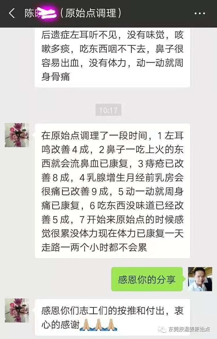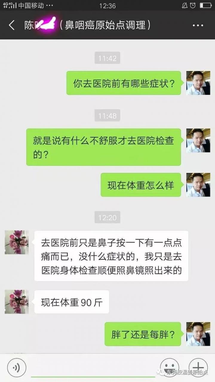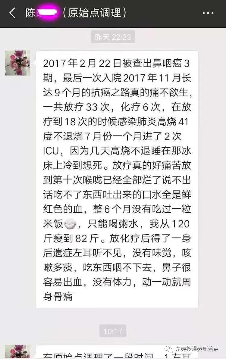 陈女士一开始只是鼻子不舒服(按一下就会痛),身体并没有别的不适,而且体力也很好,后经放化疗后,鼻子不舒服的症状不但没好,而且多了更多的其他症状:左耳听不到、咳嗽发高烧、吃东西难咽下、没味觉、流鼻血、周身骨痛、没体力没精神等等。如果一开始没有放化疗就用原始点调理,肯定能快速康复!