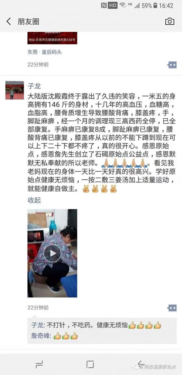 子龙微信朋友圈的分享:大陆版沈殿霞终于露出了久违的笑容,一米五的身高拥有146斤的身材,十几年的高血压,血糖高,血脂高,腰骨质增生导致腰酸背痛,膝盖疼,手,脚趾麻痹,经一个月的调理现三高西药全停,已全部康复,手麻痹已康复8成,脚趾麻痹已康复,腰酸背痛已康复,膝盖疼从以前的不能下蹲到现在可以下二十下都不疼了,真的很开心。感恩原始点,感恩詹先生创立了石碣公益原始点,感恩默默无私奉献的所有老师,看见老妈的身体一天比一天好真的很高兴,学好原始点健康无烦恼,一按二敷三姜汤加上适量运动,就能健康自做主。