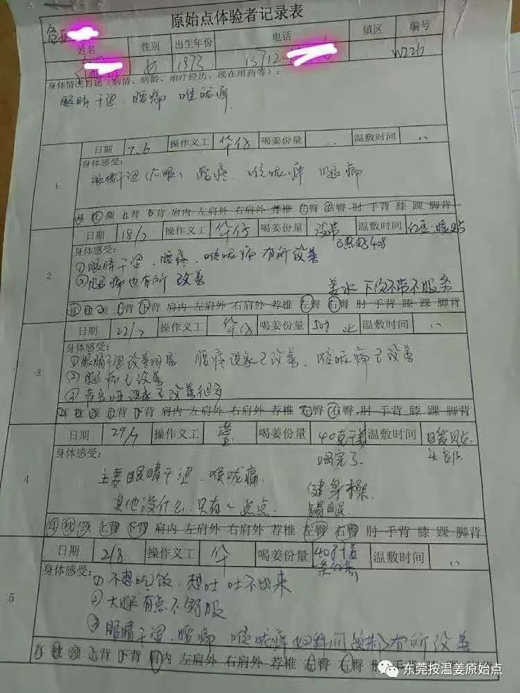 危女士,45岁,湖南人,2003年开始眼睛干涩,肾结石腰痛了一年多,乳腺增生2~3年(乳房胀痛),大腿痛半年多,危女士说身体不舒服感觉也不是很严重,又很反感去医院,所以也没吃过什么药治疗过,后来,2018年7月6号开始用原始点调理(石碣公益原始点编号W226)。