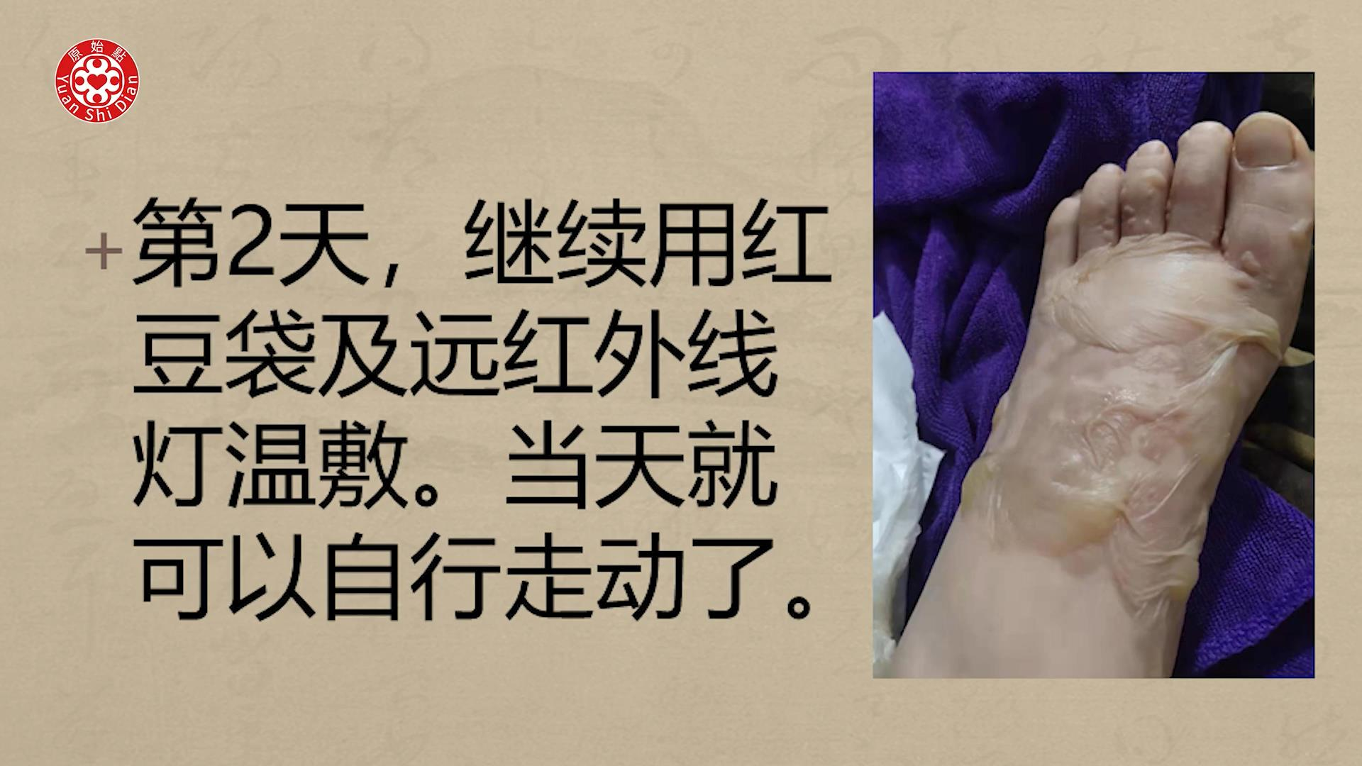 第2天,继续用红豆袋及远红外线灯温敷。当天就可以自行走动了。
