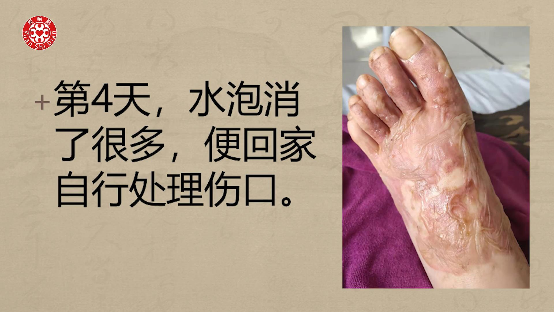 第4天,水泡消了很多,便回家自行处理伤口。