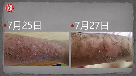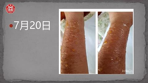 ·2019年7月19日,我身上开始长出痘疹。胳膊上黄色的水泡连成片,脸也肿了起来。