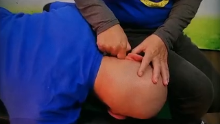 耳后,把耳垂拨开,食指测试一下,就在两股之间,靠近耳背,这里有三点,用食指直接按推下去,轻轻地按压下去,手要轻松顶进去,用拳头像钟摆一样,在两骨之间,巡三点依次按,一侧按完再按另一侧。