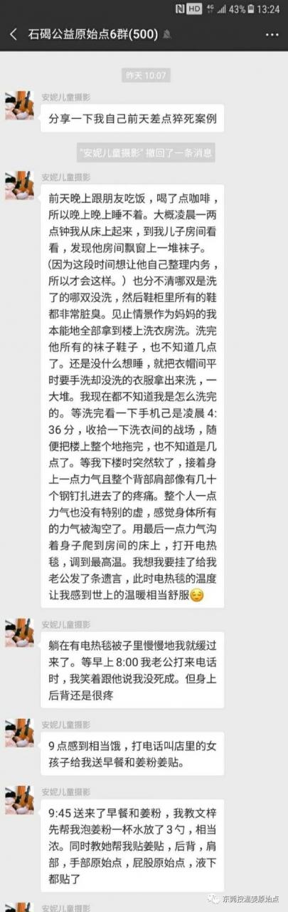 前天晚上跟朋友吃饭,喝了点咖啡,所以晚上晚上睡不着。大概凌晨一两点钟我从床上起来,到我儿子房间看看,发现他房间飘窗上一堆袜子。(因为这段时间想让他自己整理内务,所以才会这样。)也分不清哪双是洗了的哪双没洗,然后鞋柜里所有的鞋都非常脏臭。见此情景作为妈妈的我本能地全部拿到楼上洗衣房洗。洗完他所有的袜子鞋子,也不知道几点了。还是没什么想睡,就把衣帽间平时要手洗却没洗的衣服拿出来洗,一大堆。我现在都不知道我是怎么洗完的。等洗完看一下手机己是凌晨4:36分,收拾一下洗衣间的战场,随便把楼上整个地拖完,也不知道是几点了。等我下楼时突然软了,接着身上一点力气且整个背部肩部像有几十个钢钉扎进去了的疼痛。整个人一点力气也没有特别的虚,感觉身体所有的力气被淘空了。用最后一点力气沟着身子爬到房间的床上,打开电热毯,调到最高温。我想我要挂了给我老公发了条遗言,此时电热毯的温度让我感到世上的温暖相当舒服。