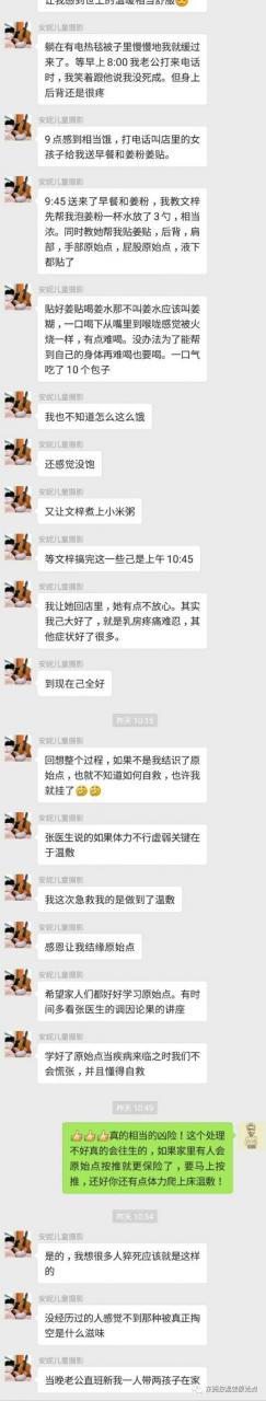 我也不知道怎么这么饿,还感觉没饱,又让文梓煮上小米粥等,文梓搞完这一些己是上午10:45,我让她回店里,她有点不放心。其实我已大好了,就是乳房疼痛难忍,其他症状好了很多。到现在已全好,回想整个过程,如果不是我结识了原始点,也就不知道如何自救,也许我就挂了。