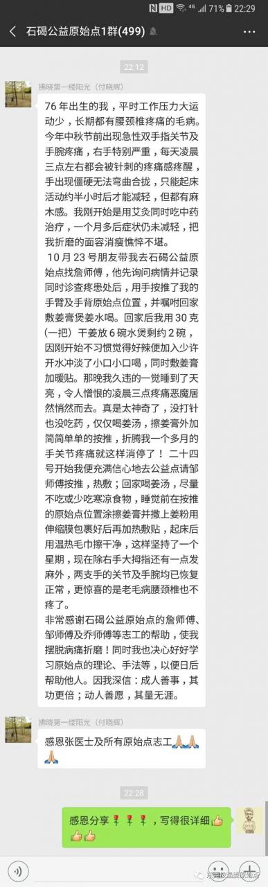 10月23号朋友带我去石碣公益原始点找詹师傅,他先询问病情并记录同时诊查疼患处后,用手按推了我的手臂及手背原始点位置,并嘱咐回家敷姜膏煲姜水喝。回家后我用30克(一把)干姜放6碗水煲剩约2碗,因刚开始不习惯觉得好辣便加入少许开水冲淡了小口小口喝,同时敷姜膏加暖贴。那晚我久违的一觉睡到了天亮,令人憎恨的凌晨三点疼痛恶魔居然悄然而去。真是太神奇了,没打针也没吃药,仅仅喝姜汤,擦姜膏外加简简单单的按推,折腾我一个多月的手关节疼痛就这样消停了!二十四号开始我便充满信心地去公益点请邹师傅按推,热敷;回家喝姜汤,尽量不吃或少吃寒凉食物,睡觉前在按推的原始点位置涂擦姜膏并撒上姜粉用伸缩膜包裹好后再加热敷贴,起床后用温热毛巾擦干净,这样坚持了一个星期,现在除右手大拇指还有一点发麻外,两支手的关节及手腕均已恢复正常,更惊喜的是老毛病腰颈椎也不疼了。