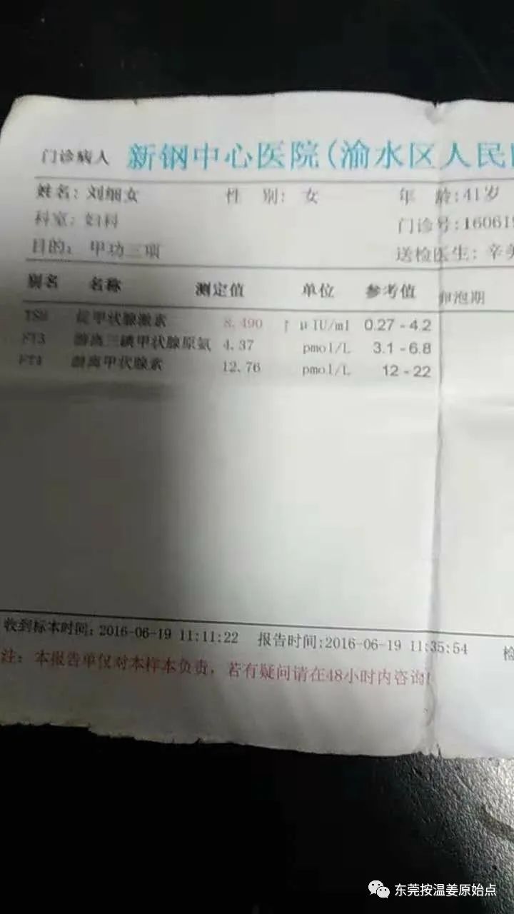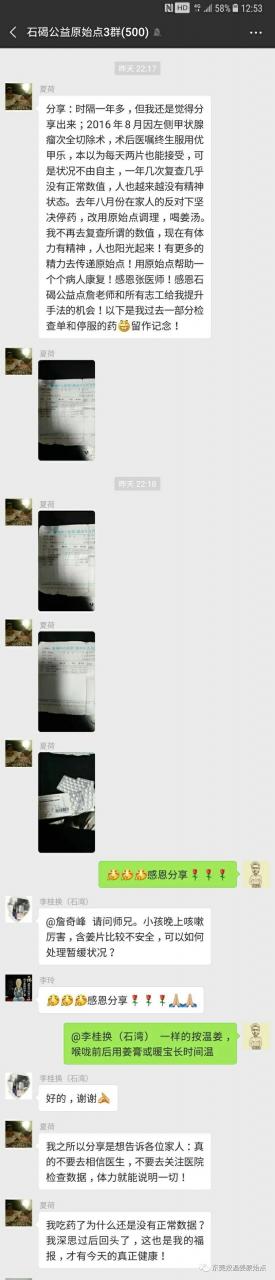 分享:时隔一年多,但我还是觉得分享出来;2016年8月因左侧甲状腺瘤次全切除术,术后医嘱终生服用优甲乐,本以为每天两片也能接受,可是状况不由自主,一年几次复查几乎没有正常数值,人也越来越没有精神状态。去年八月份在家人的反对下坚决停药,改用原始点调理,喝姜汤。我不再去复查所谓的数值,现在有体力有精神,人也阳光起来!有更多的精力去传递原始点!用原始点帮助一个个病人康复!感恩张医师!感恩石碣公益点詹老师和所有志工给我提升手法的机会!以下是我过去一部分检查单和停服的药留作记念。