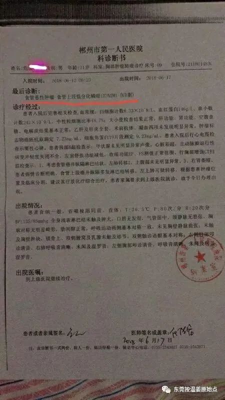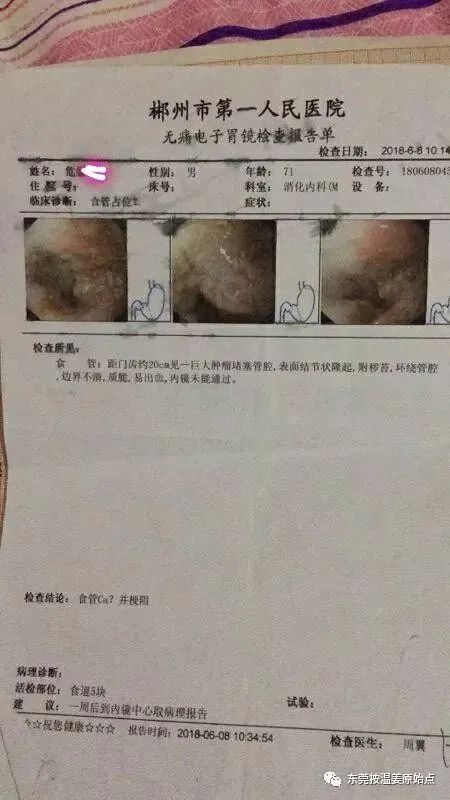 危先生,71岁,湖南人,因平时说话声音沙哑,吃饭、喝水感觉有东西卡住,于2018年6月12号在郴州医院检查,住院5天等待检查结果,住院五天只是吃药,拒绝输液,五天后,也就是2018年6月17号检查报告单出来了,危先生平时身体上的种种不适原来是【食道癌晚期】,因危先生的女儿了解过原始点,知道放疗化疗对身体的伤害,说服了家人,拒绝了医院的治疗,并以到上级医院治疗为由办理了出院手续。