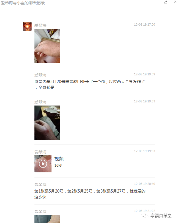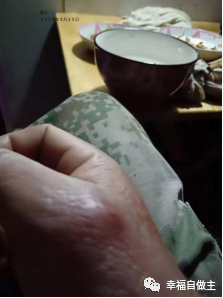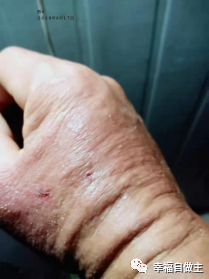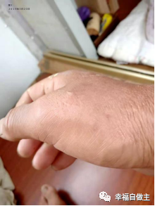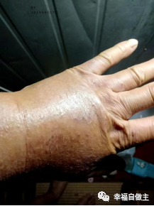 到了6月17日,另一只手上因湿气也长满了水泡,虎口处的大包也越来越大(如图)。