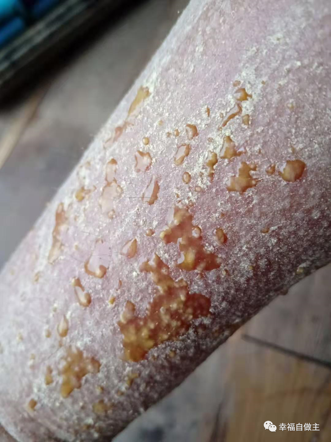 当时也没太在意,可是,没想到病情发展的很快,没过两天就全身起疹子,有的地方还溃烂流水了(如图)