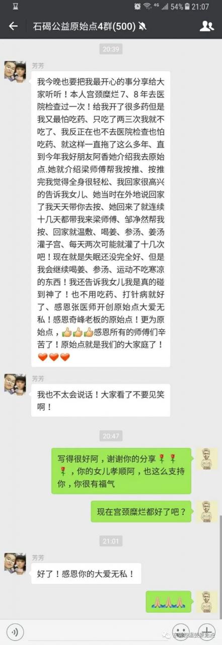 我今晚也要把我最开心的事分享给大家听听!本人宫颈糜烂7、8年去医院检查过一次!给我开了很多药但是我又最怕吃药、只吃了两三次我就不吃了、我反正在也不去医院检查也怕吃药、就这样一直拖了这么多年、直到今年我好朋友阿香她介绍我去原始点.她就介绍梁师傅帮我按推、按推完我觉得全身很轻松、我回家很高兴的告诉我女儿、她当时在外地说回家了我天天带你去按、她回来了就连续十几天都带我来梁师傅、邹净然帮我按、回家就温敷、喝姜、参汤、姜汤灌子宫、每天两次可能就灌了十几次吧!现在就是失眠还没完全好、但是我会继续喝姜、参汤、运动不吃寒凉的东西!我还告诉我女儿我是真的碰到神了!也不用吃药、打针病就好了、感恩张医师开创原始点大爱无私!感恩奇峰老板的原始点!更为原始点,感恩所有的师傅们辛苦了!原始点就是我们的大家庭了。
