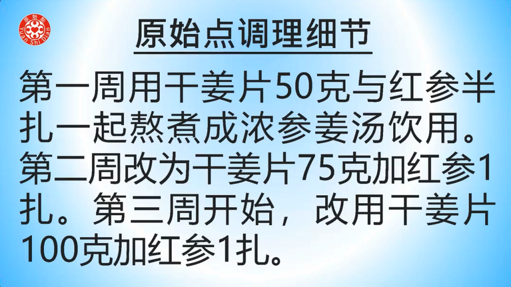 原始点调理细节第一周用干姜片50克与红参半扎一起熬煮成浓参姜汤饮用。