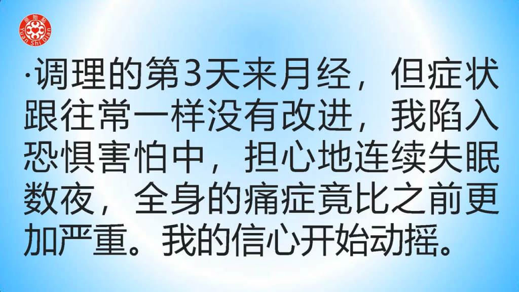 调理的第3天来月经,但症状跟往常一样没有改进,我陷入恐惧害怕中,担心地连续失眠数夜,全身的痛症竟比之前更加严重。我的信心开始动摇。