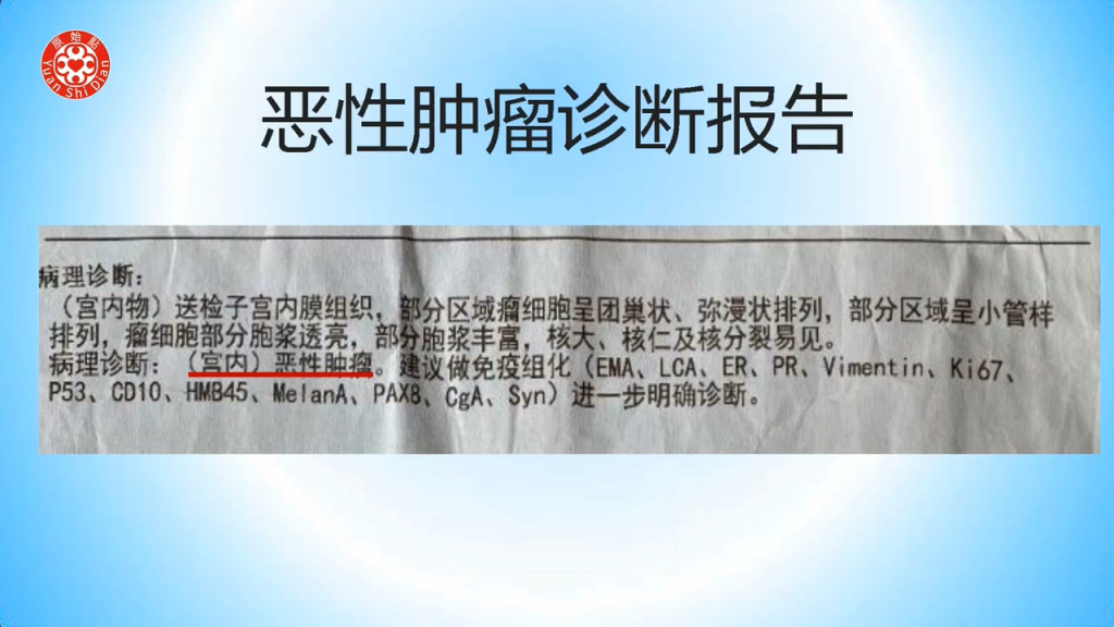 2020年3月底,又连续出血40多天不止,排出的经血都是腥臭的暗红色大血块。5月10日确诊已转为子宫恶性肿瘤。