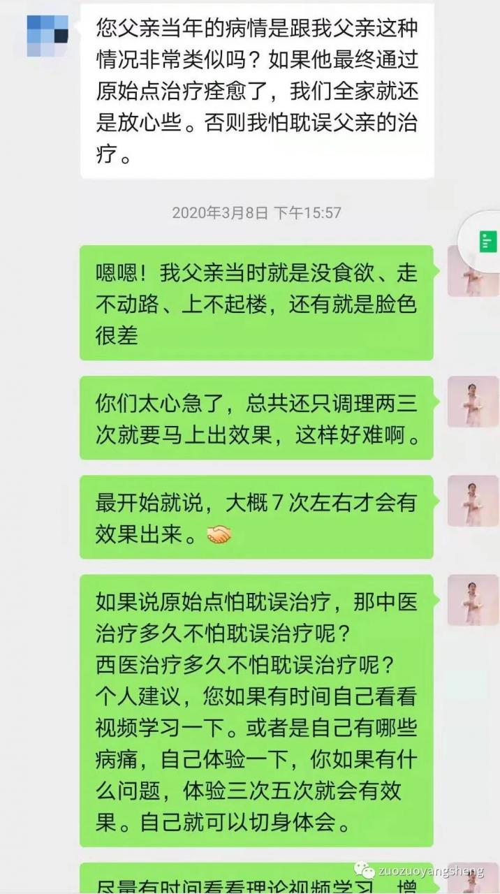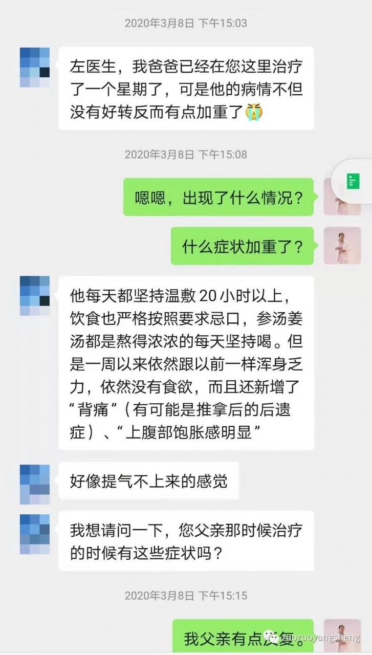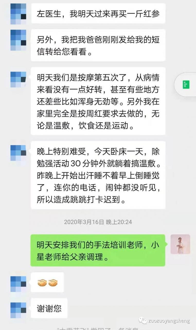 3月8日(距离过来已经有一周),第三次调理,雪芬发微信反馈“病情不但没有好转,反而有点加重了。”症状的反复,把本就不够坚定的信念都快磨平了,雪芬一直找我认证“当年我的父亲的情况是否情况类似,最终是否通过原始点治疗痊愈了。”因为当时我在做月子,我们的都是以微信沟通的。