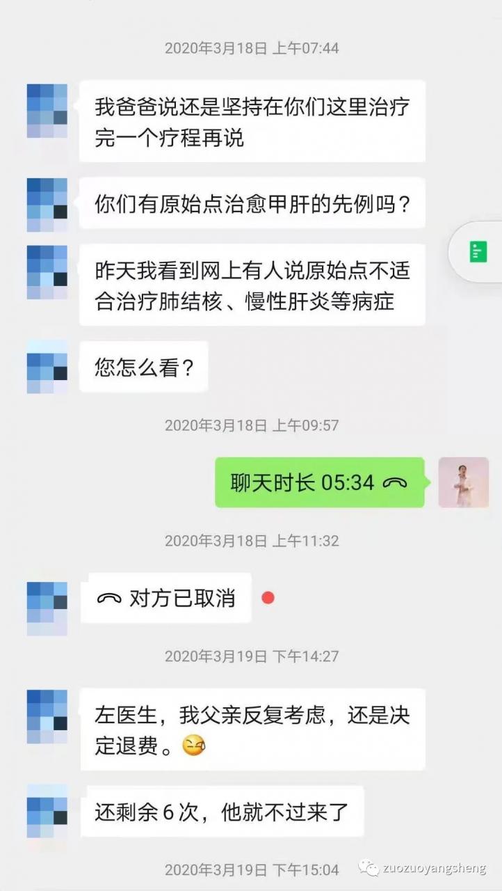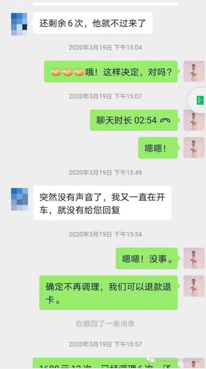 3月17日,第六次调理,小星老师给刘老先生按推。第二天(18日),雪芬就表达了坚定的态度,说“我爸爸说还是在你们这里治完一个疗程再说。”。我担忧的情绪稍微有所缓解,没想到第三天(19日)雪芬就马上变卦了,下午她发微信给我“我父亲反复考虑,说要退费。”