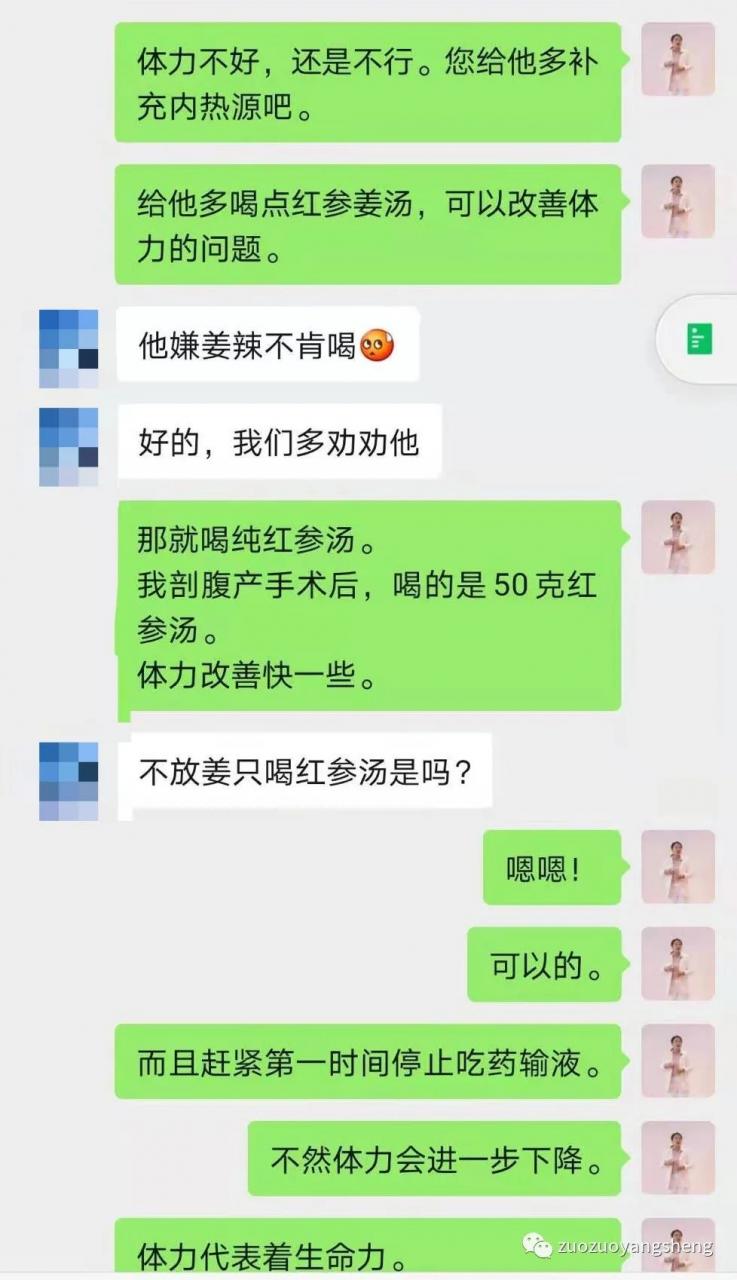 第一天调理,刘老先生很愿意配合,按要求带了红参和姜回去熬着喝。当时,刘老先生并没有去医院检查,还没确诊为癌症。就刘老先生当时的状态来看,也是重病患者无疑了。