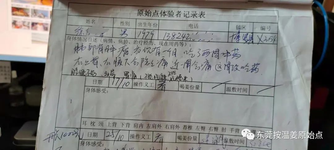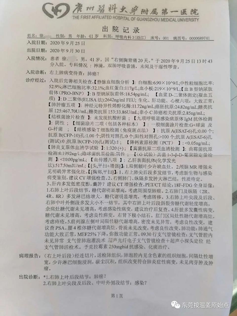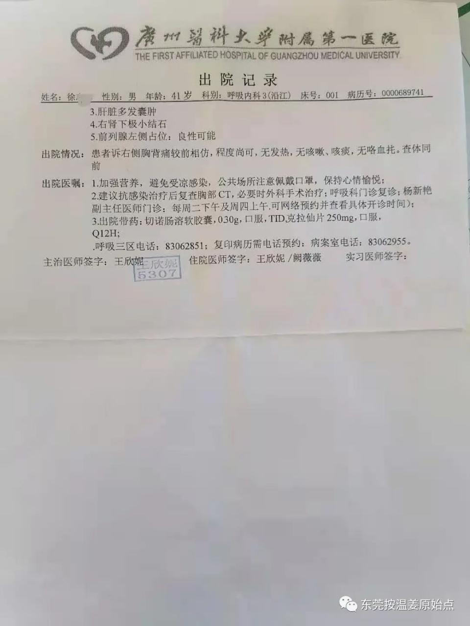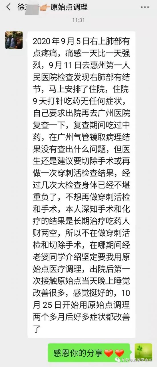 徐先生,广东惠州人,今年42岁,2020年9月5日右上肺部有点疼痛,痛感一天比一天强烈,9月11日去惠州第一人民医院检查发现右肺部有结节,马上安排了住院,住院9天打针吃药后,身体无任何症状,自己要求出院再去广州医院复查一下,复查期间吃过中药,在广州气管镜取病理结果没有查出什么问题,但医生还是建议要切除手术或再做一次穿刺活检查结果,经过几次大检查身体已经不堪重负了,不想再做穿刺活检和手术,徐先生深知手术和化疗的结果是长期治疗吃药人财两空,所以不再做穿刺活检和切除手术,在那期间经老婆同学介绍坚定要徐先生用原始点调理,出院后第一次接触原始点(2020年10月17号第一次来石碣公益原始点,石碣公益原始点编号X354),当天晚上睡觉改善很多,感觉挺好的,10月25日开始用原始点调理两个多月后好多症状都改善了。